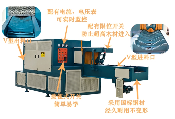 送 料:采用V型鏈條輸送,機上配有變頻智能調速器,可以對大小木料的進料速度實行自由調速。原木可以實現自動分中,機上還配有限位開關,防止超去規格木料進入,防止卡木避免對機器造成損壞。