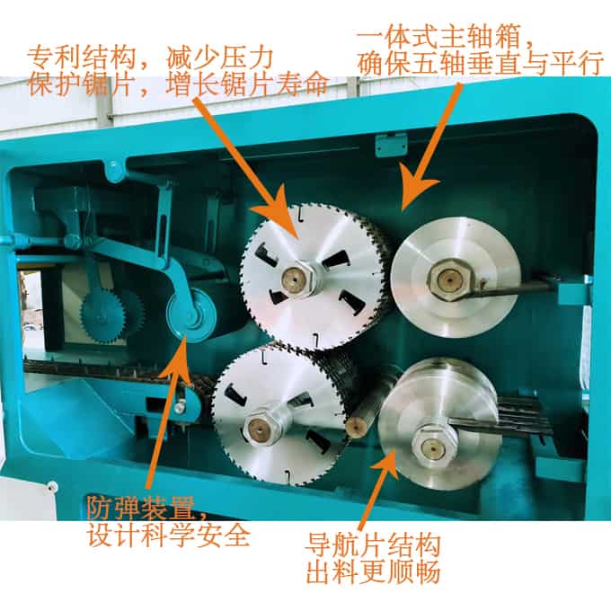 送 料:采用四排尖齒鏈條輸送,機上配有變頻智能調速器,可以對大小木料的進料速度實行自由調速。原木可以實現(xiàn)自動分中,機上還配有限位開關,防止超去規(guī)格木料進入,防止卡木避免對機器造成損壞。